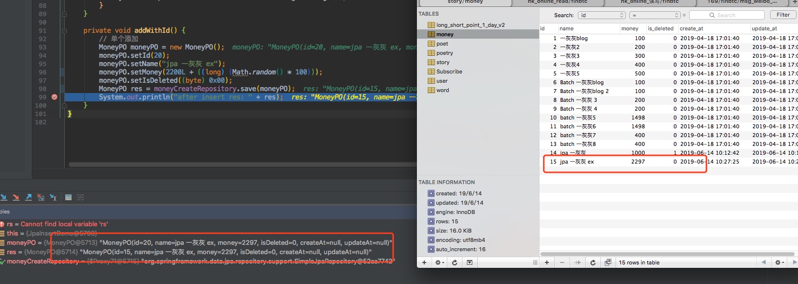 @Entity注解有一个参数name,用于指定表名,如果不主动指定时,默认用类名,即上面如果不指定那么,那么默认与表moneypo绑定