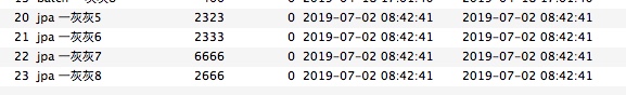 1 | [MoneyPO(id=20, name=jpa 一灰灰5, money=2323, isDeleted=0, createAt=2019-07-02 08:42:41.0, updateAt=2019-07-02 08:42:41.0), MoneyPO(id=22, name=jpa 一灰灰7, money=6666, isDeleted=0, createAt=2019-07-02 08:42:41.0, updateAt=2019-07-02 08:42:41.0), MoneyPO(id=23, name=jpa 一灰灰8, money=2666, isDeleted=0, createAt=2019-07-02 08:42:41.0, updateAt=2019-07-02 08:42:41.0)] |
