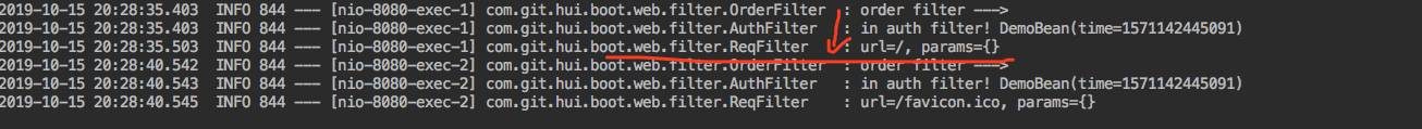 上面是测试时关键链路的断点截图,从数组中可以看出 AuthFilter的优先级大于ReqFilter, 下面实际的输出也说明了@Order注解不能指定Filter的优先级(不知道为什么网络上有大量使用Order来指定Filer优先级的文章!!!)
