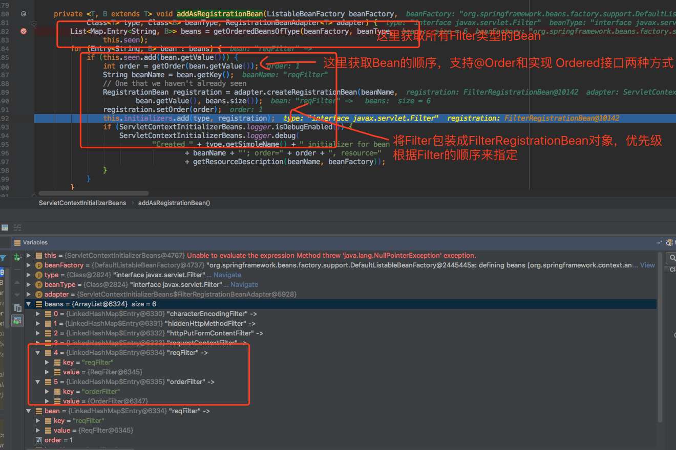 在getOrderedBeansOfType(beanFactory, ServletContextInitializer.class)的调用中就返回了我们自定义的Bean,也就是说我们自定义的Filter被认为是ServletContextInitializer的类型了