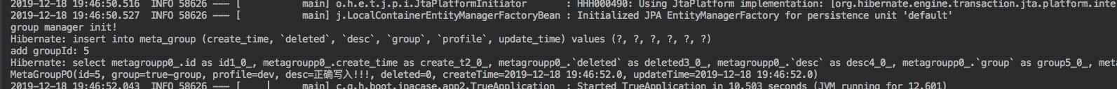 public TrueApplication(GroupManager groupManager) { int groupId = groupManager.addGroup("true-group", "dev", "正确写入!!!"); System.out.println("add groupId: " + groupId); MetaGroupPO po = groupManager.getOnlineGroup("true-group", "dev"); System.out.println(po); }