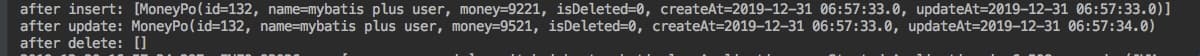 List<MoneyPo> list = moneyMapper.selectList(new QueryWrapper<MoneyPo>().lambda().eq(MoneyPo::getName, po.getName())); System.out.println("after insert: " + list);