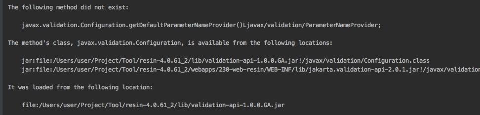 jar包冲突,如下图,提示有两个validation-api, 在项目中我们自己依赖的是jakarta.validation-api-2.0.1,但是实际采用的是resin的validation-api-1.0.0.GA.jar