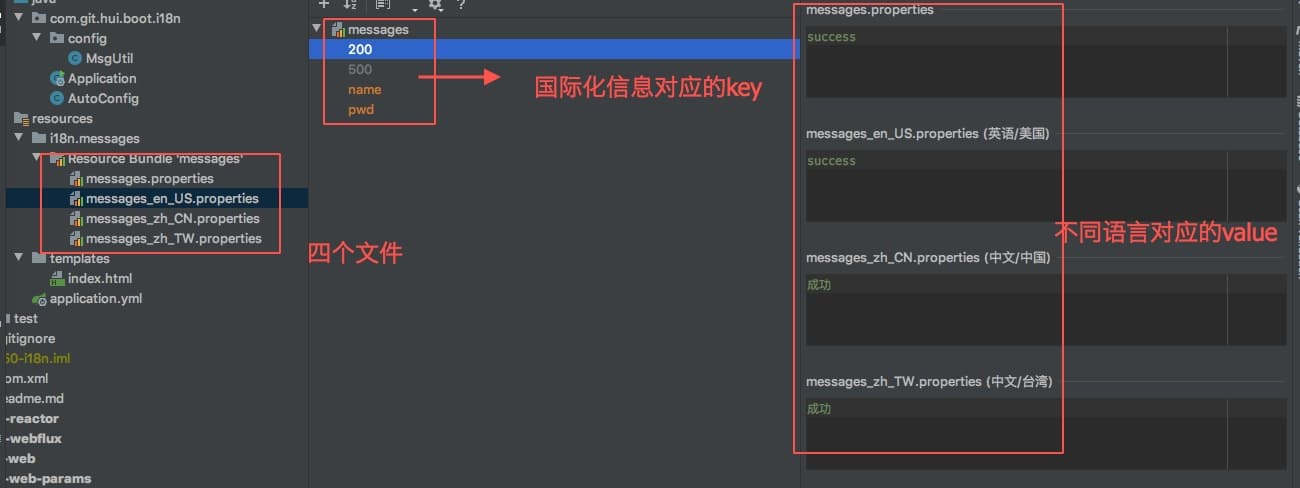 所以在资源目录下,新建文件 i18n/messages,国际化文件名为 messages-xxx.properties,项目结果如