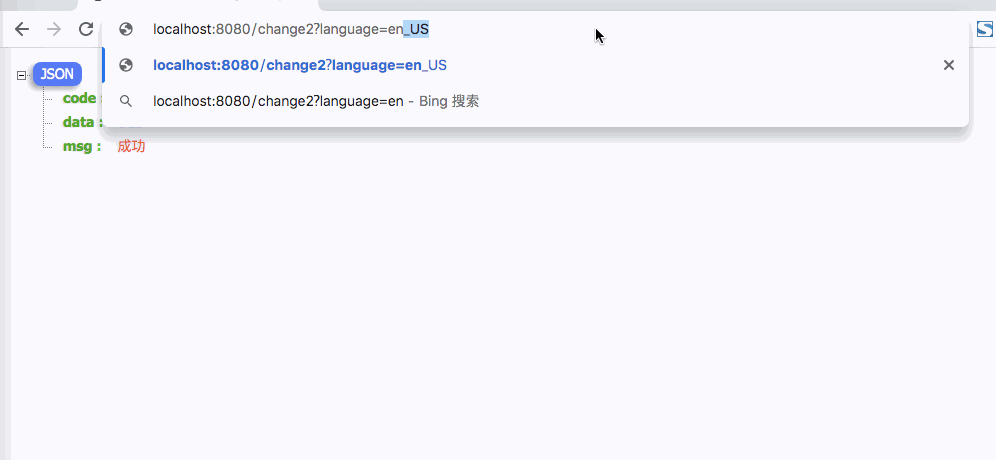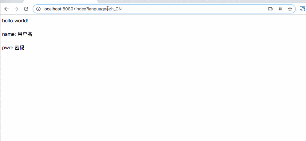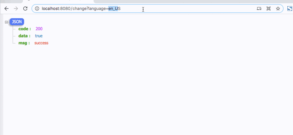 1 2 3 4 5 6 7 8 9 10 11 12 13 14 15 16 17 18 19 20 21 22 23 24 25 26 27 28 29 @Controller @SpringBootApplication public class Application { public Application (MessageSource messageSource) { MsgUtil.inti(messageSource); } public static void main (String[] args) { SpringApplication.run(Application.class); } @Data @Accessors(chain = true) public static class RspWrapper <T> { private int code; private String msg; private T data; } @GetMapping(path = "change") @ResponseBody public String changeLocal (String language) { String[] s = language.split("_" ); LocaleContextHolder.setLocale(new Locale (s[0 ], s[1 ])); RspWrapper res = new RspWrapper <>().setCode(200 ).setMsg(MsgUtil.get("200" )).setData(true ); return JSON.toJSONString(res); } }