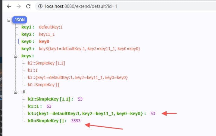 | @GetMapping(path = "ttl") public Map ttl(String k) { Map<String, Object> res = new HashMap<>(); res.put("execute", extendDemo.ttl(k)); res.put("ttl", getTtl("ttl::" + k)); return res; }