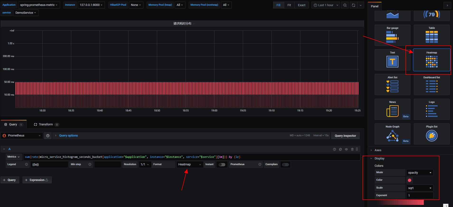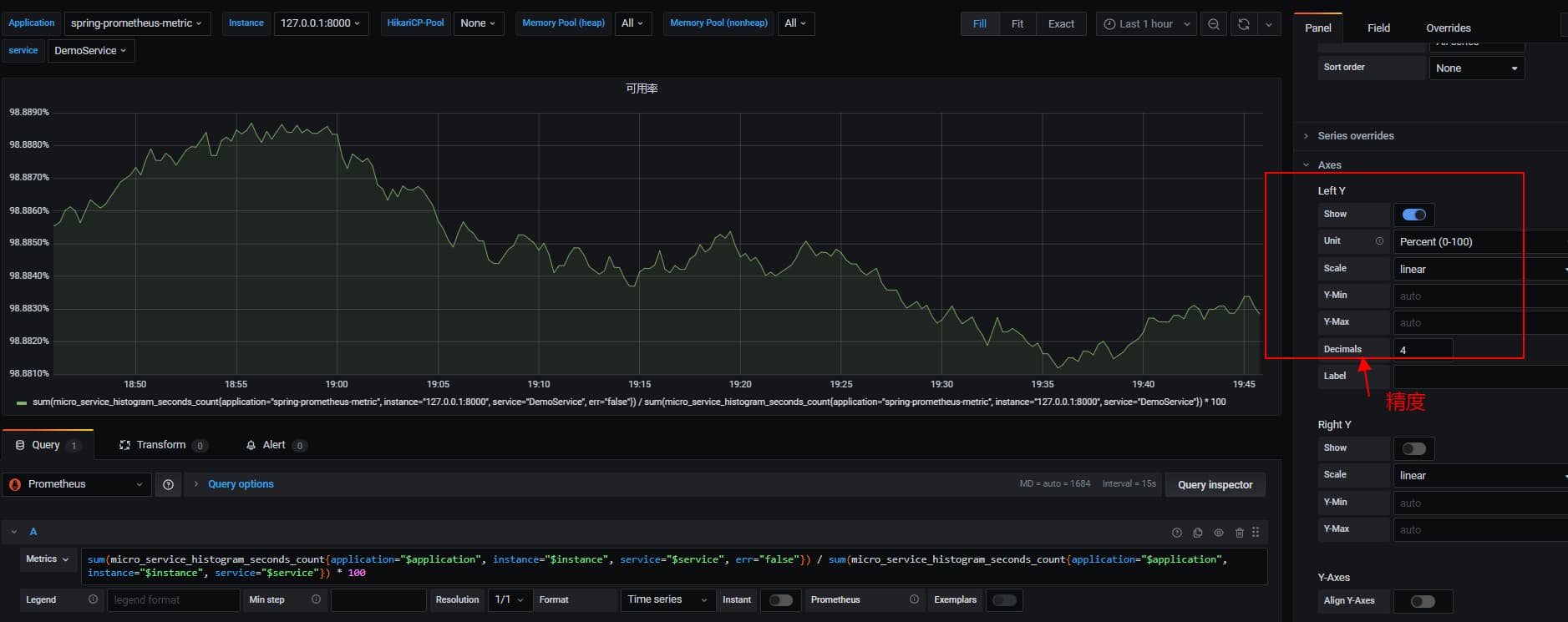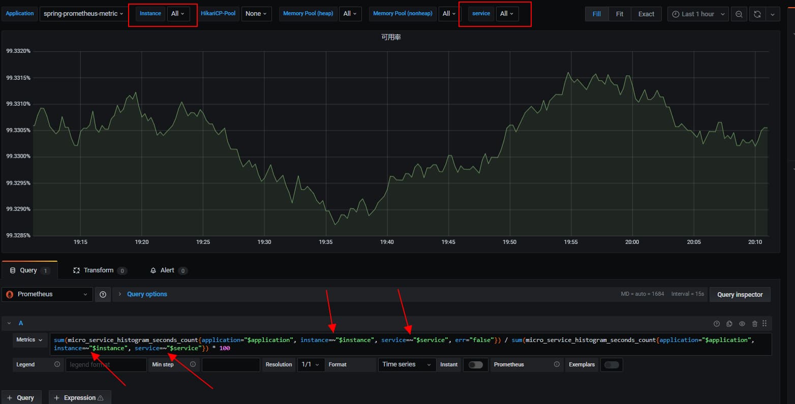 micro_service_histogram_seconds_count,而application与instance则选取的是Prometheus-Spring组件上报的spring应用基础信息中的metric