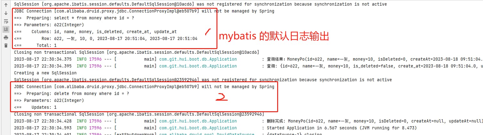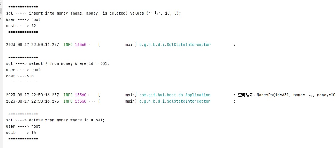 | @Slf4j @SpringBootApplication public class Application { public Application(MoneyMapper mapper, JdbcTemplate jdbcTemplate) { MoneyPo po = new MoneyPo(); po.setName("一灰"); po.setMoney(10L); po.setIsDeleted(0); mapper.save(po);