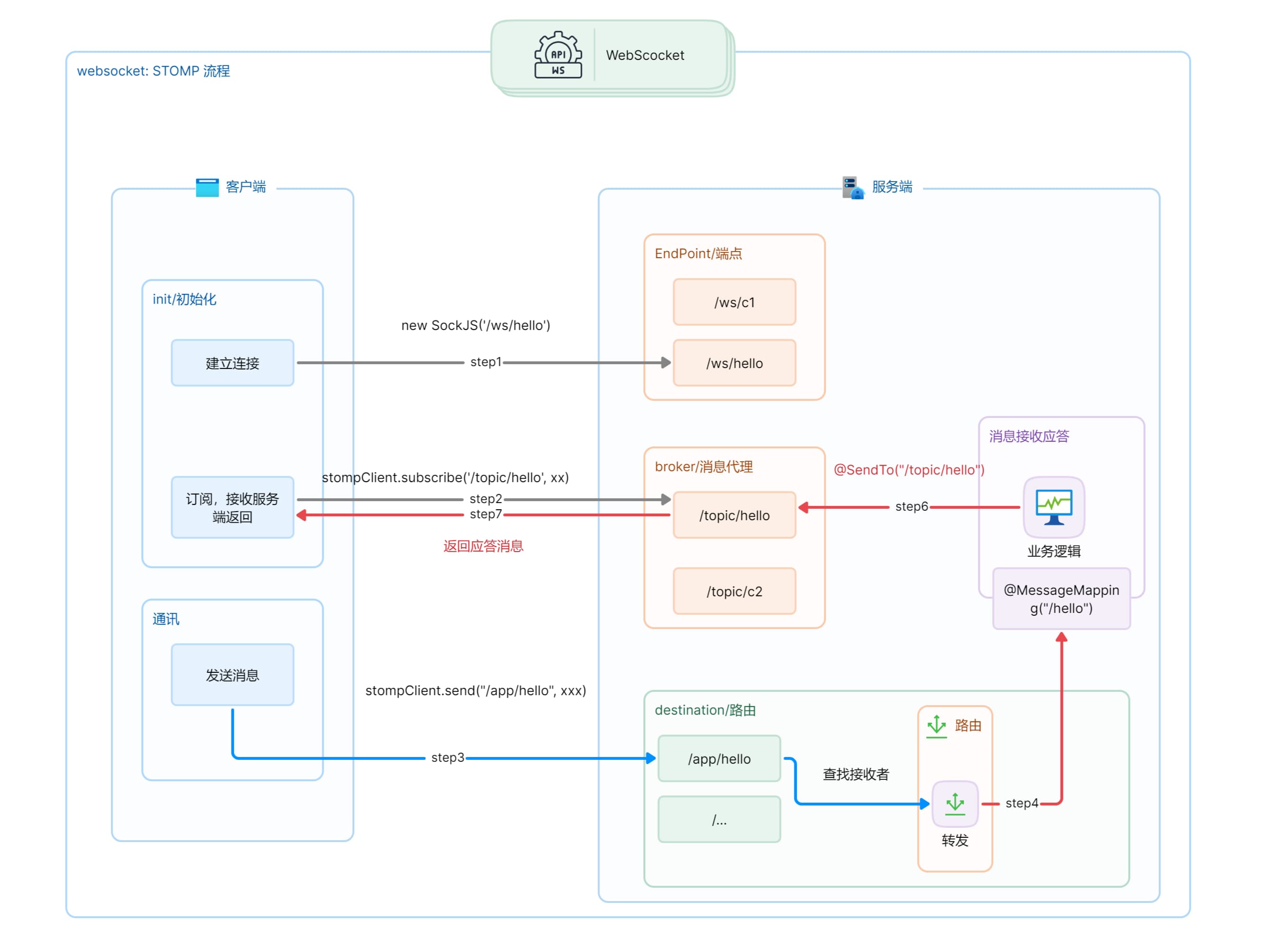处理STOMP帧:服务器收到STOMP帧后,会根据帧的类型进行相应的处理。例如,如果收到一个SUBSCRIBE帧,服务器就会为客户端创建一个订阅;如果收到一个SEND帧,服务器就会将消息发送给指定的目的地。