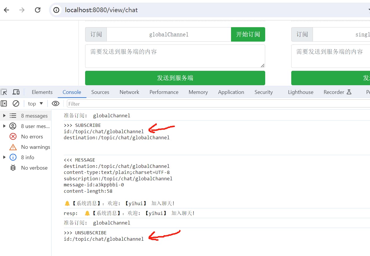 完整的前端代码可以参考项目源码中的 chat.html, 下面是关键的订阅/取消订阅逻辑