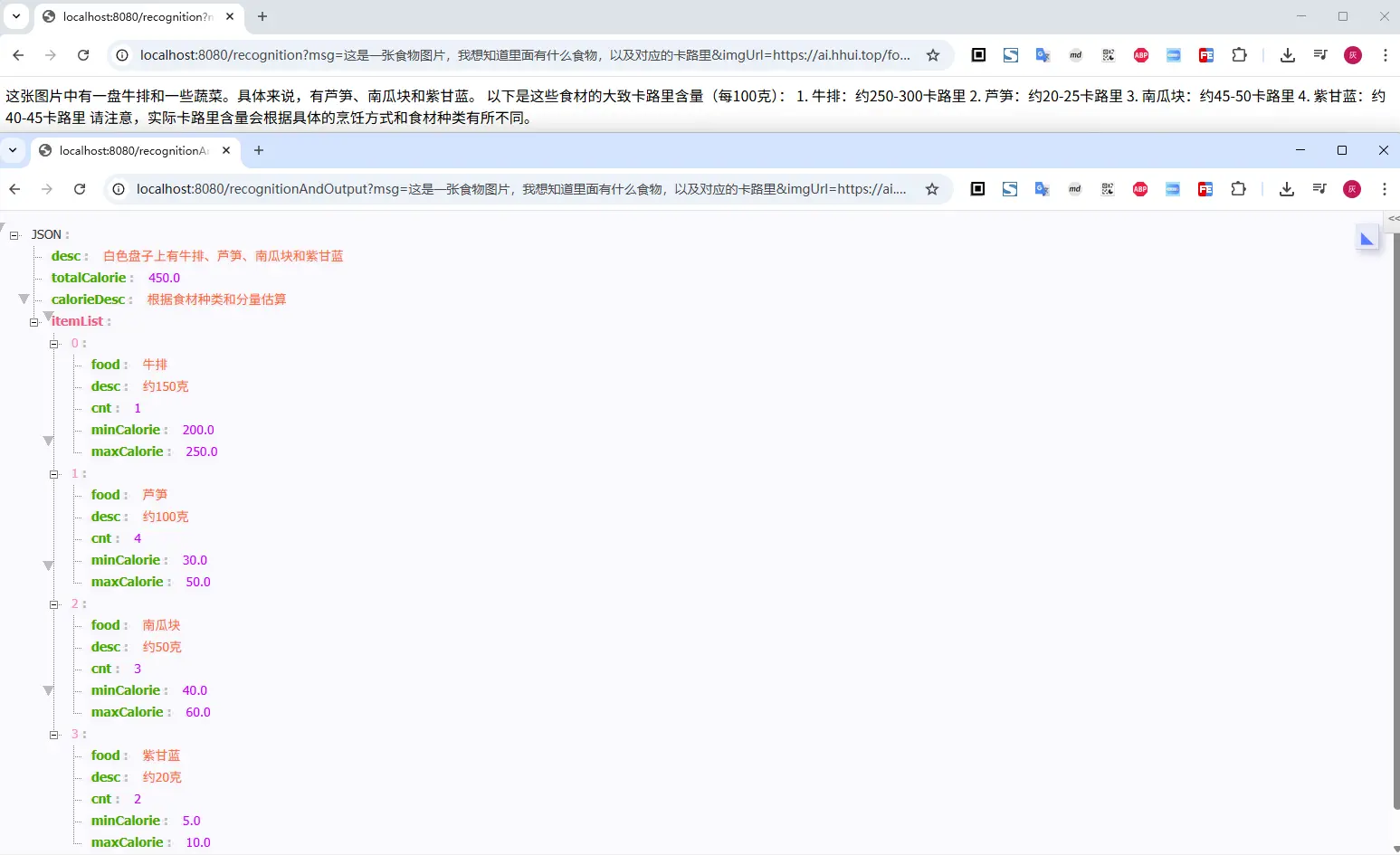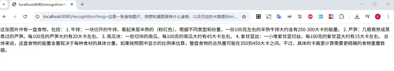 | http://localhost:8080/recognition?msg=这是一张食物图片,我想知道里面有什么食物,以及对应的卡路里&imgUrl=https://ai.hhui.top/food.png