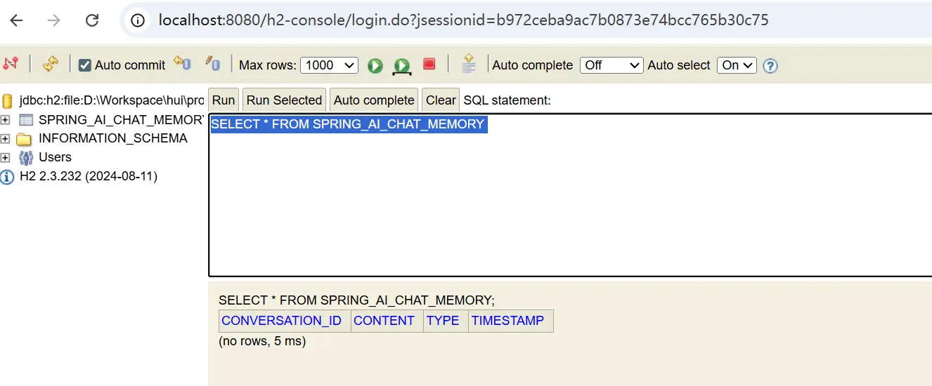启动成功之后,我们可以在h2-console中看到新增了一个表 SPRING_AI_CHAT_MEMORY