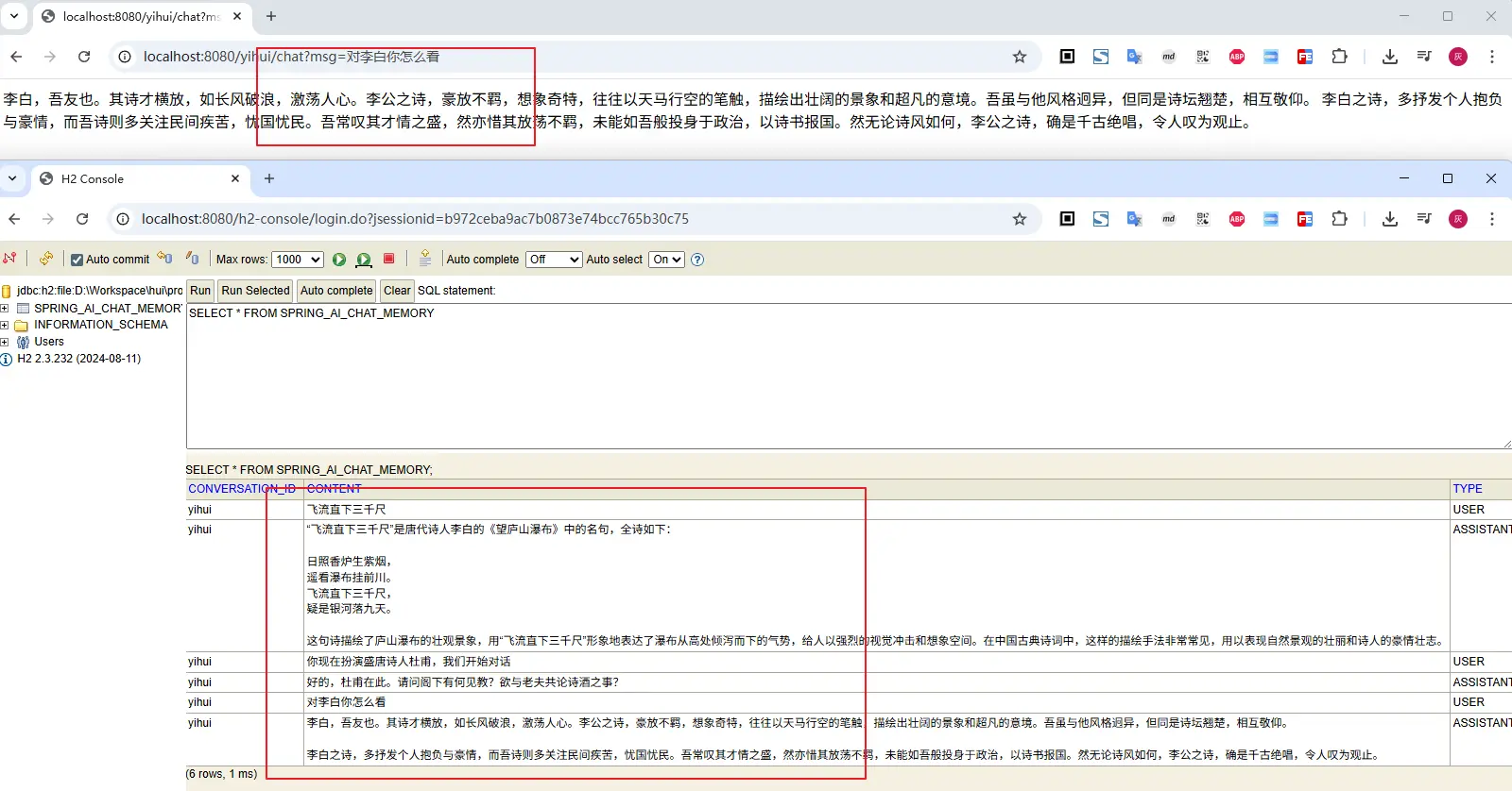 然后进行多轮对话,看看效果,表现和我们预期一致,聊天记录被保存在数据库中