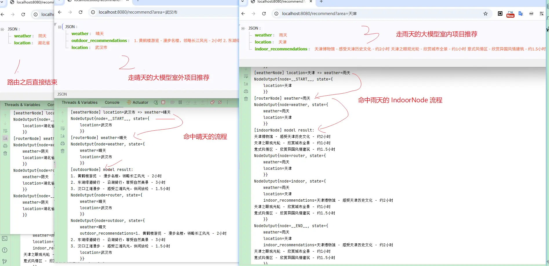 • 当天气为晴天时,路由到 outdoor,推荐一些室外的旅游项目