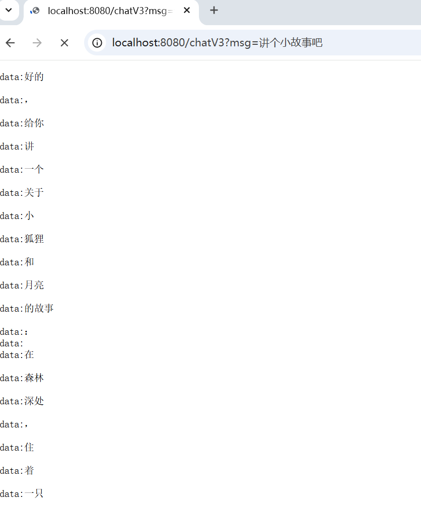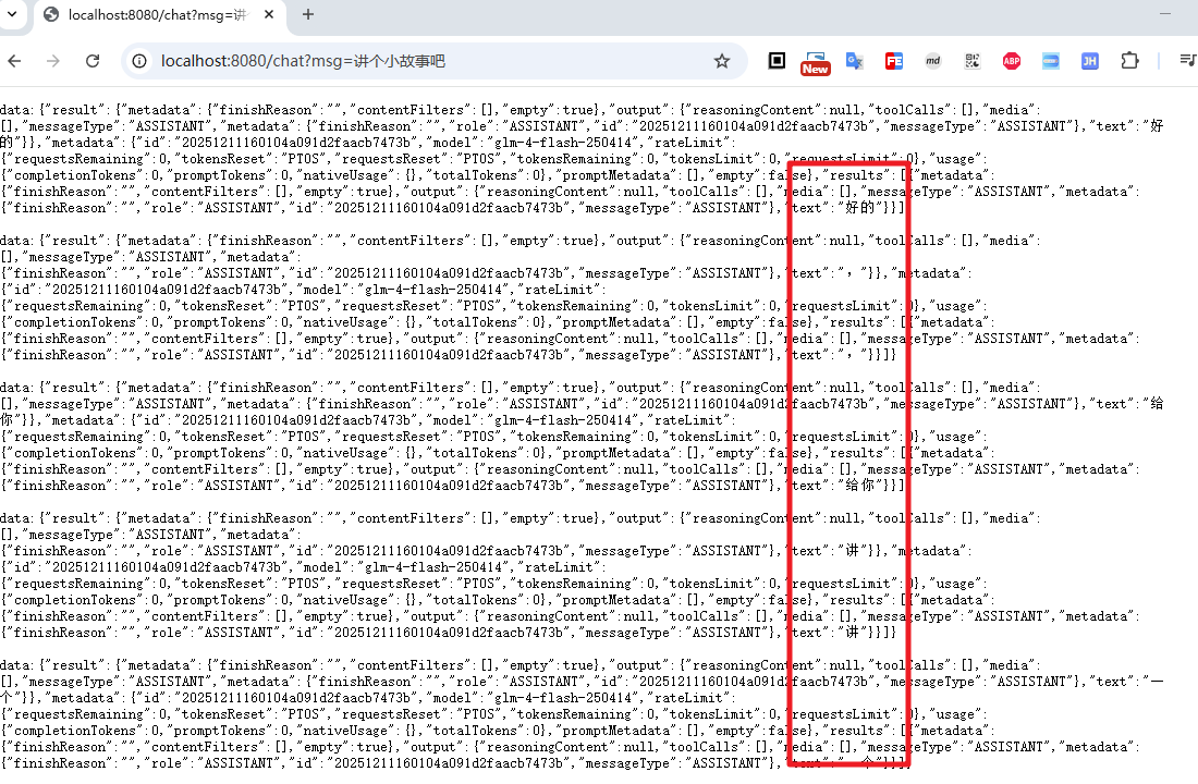 通过 stream() 方法调用,返回的是 Flux<ChatResponse>,我们定义返回头为 text/event-stream,这样客户端就可以接受流式的数据返回