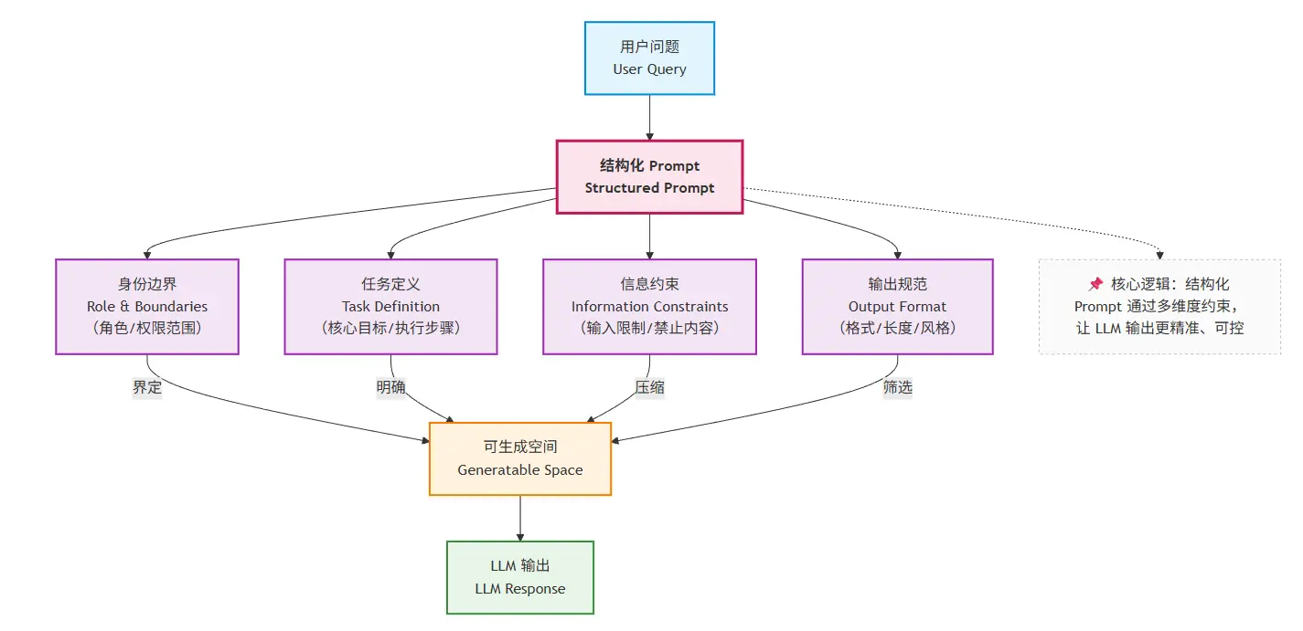 既然 Prompt 的本质是“约束生成空间”,那么它就不应该是随意拼接的字符串,而应该具备清晰、稳定、可复用的结构。