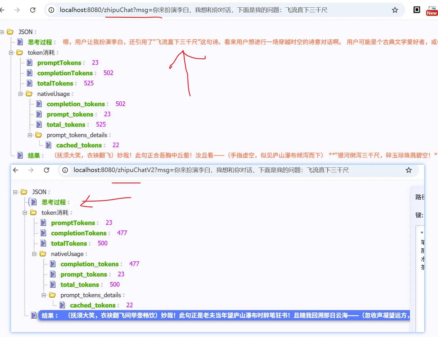 return Map.of("思考过程", reason, "结果", content, "token消耗", usage);