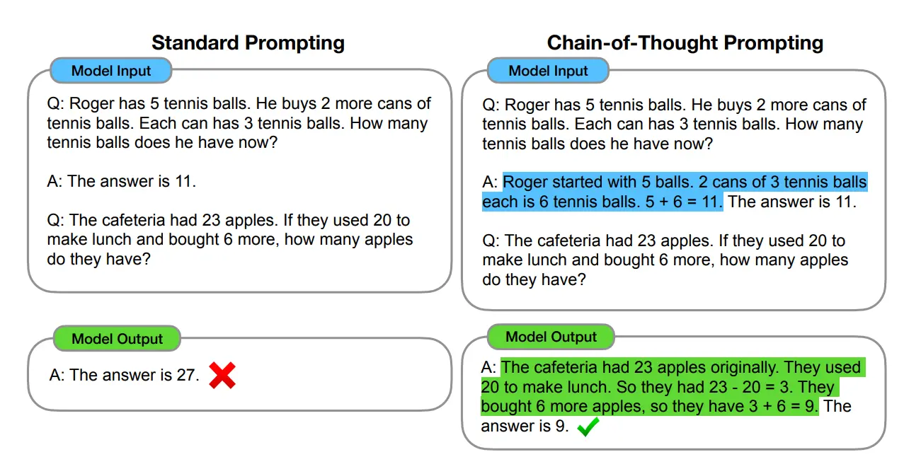 CoT提示过程,更像是一种提示词工程(Prompt Engineering),通过向大语言模型展示一些少量的 exapmles,在样例中解释推理过程,大语言模型在回答提示时也会显示推理过程。