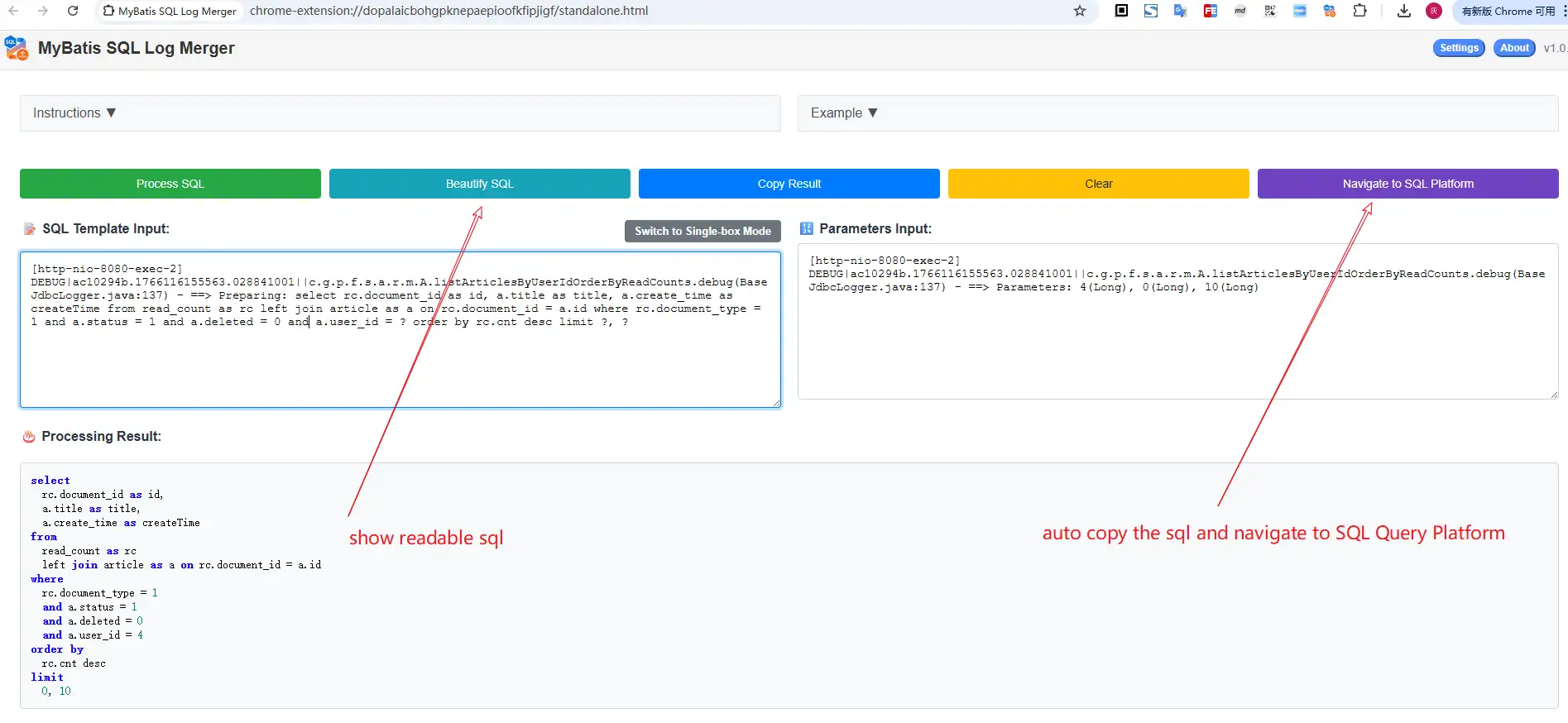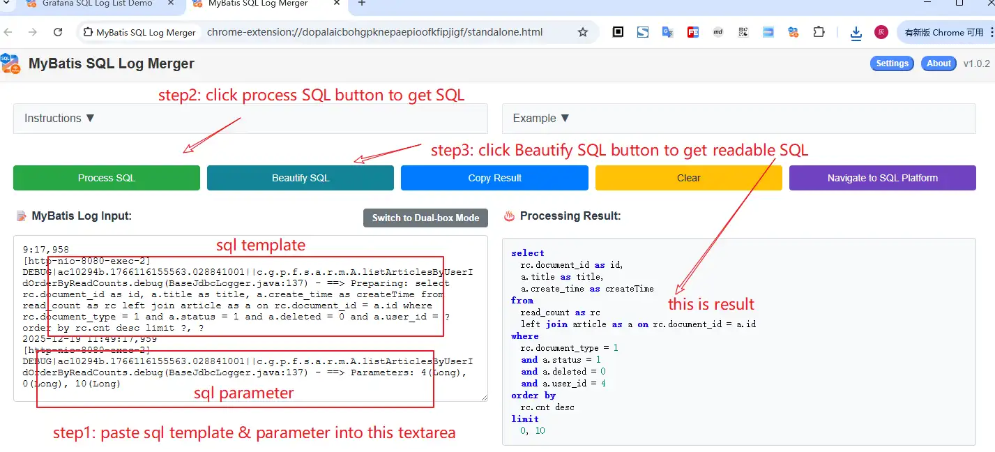 - 安装插件:从Chrome应用商店安装 MyBatis SQL Log Merger