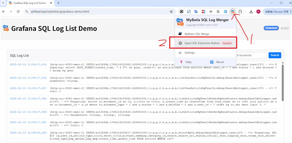 除了上面的在目标网站上注入合成按钮之外,这个插件还提供了一个独立的页面,适用于从非浏览器场景获取Mybatis执行日志的场景,如 IDEA 的控制台日志: